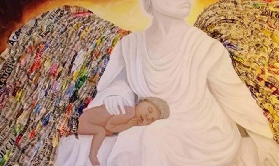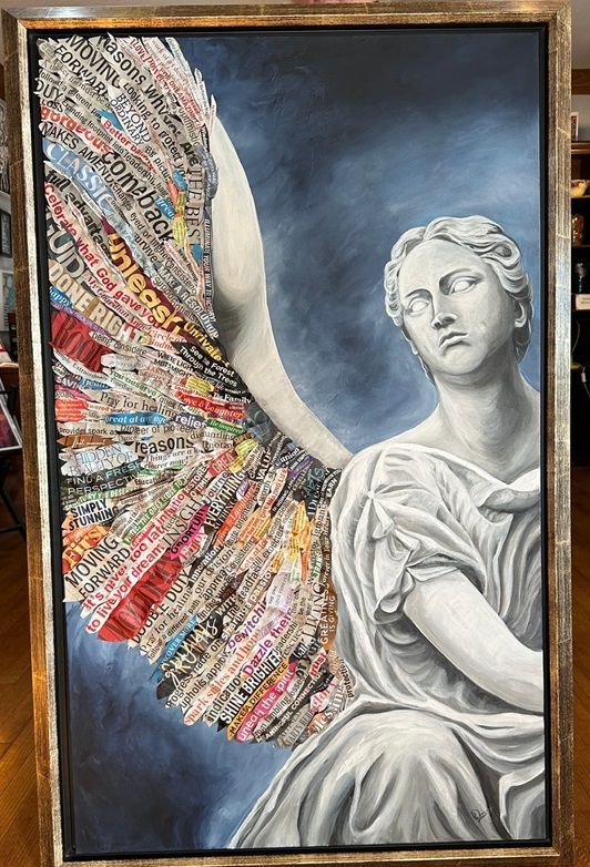 Each wing of my Angels are made up from headlines cut from daily papers. The headlines pertain to the burden or subject of each Angel. "Burdened, but with Hope" consists of the headlines of war, murder, theft, disease and such. But mixed with it are the headlines of good Samaritans, medical cures and other examples of Hope. I also worked into it the wording of The Lord's Prayer. I felt my burden lifted upon its completion and was further elated when a Christian Healing Center purchased it for their entry way.