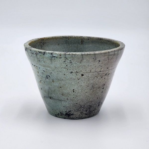 Raku. 3 1/4 inches tall and 4 1/2 inches wide. It’s speckled with black and brownish flakes on top of a stone gray. $50 and FREE shipping